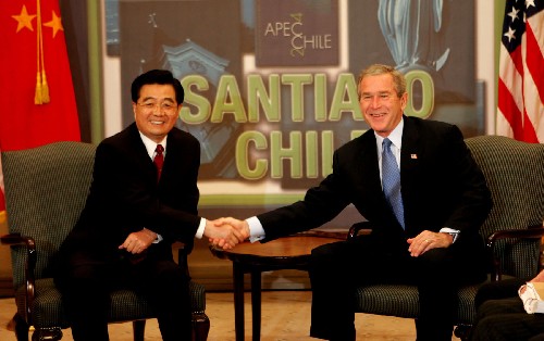2004年11月20日,中国国家主席胡锦涛在智利首都圣地亚哥市出席亚太经合组织领导人非正式会议期间会见美国总统布什。 新华社记者 樊如钧 摄