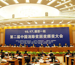 17日是“国际消除贫困日”,第二届中国消除贫困奖颁奖大会在人民大会堂隆重举行。中共中央政治局常委、国务院总理温家宝作出重要批示。他指出,中国扶贫事业取得了举世公认的巨大成就,但消除贫困仍然需要做长期艰苦的努力。扶贫是我国的一项历史性任务。各级政府必须高度重视扶贫工作,加大投入力度,努力改善贫困地区的生产生活条件。全社会要大力支持和积极参与扶贫事业,让团结互助、扶贫济困蔚成风气。在扶贫工作中涌现的模范人物值得表彰,他们的崇高精神和感人事迹要广泛宣传。中共中央政治局委员、国务院副总理回良玉在会上强调,要采取更加有力的举措,尽快解决贫困人口的温饱问题,让他们参与发展进程、共享发展成果,促进贫困地区经济社会全面发展。