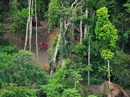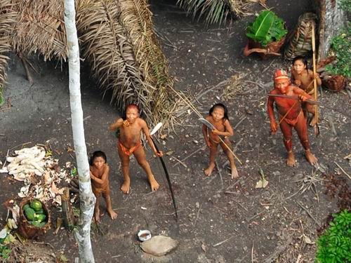 摄影师在高空拍摄到这些部落居民身体上涂有红色和黑色植物萃取液,这个独特的印第安部落不会立即出现危险,但是秘鲁森林采伐业将迫使其它部落进入巴西境内,那里的生存环境更好一些。
