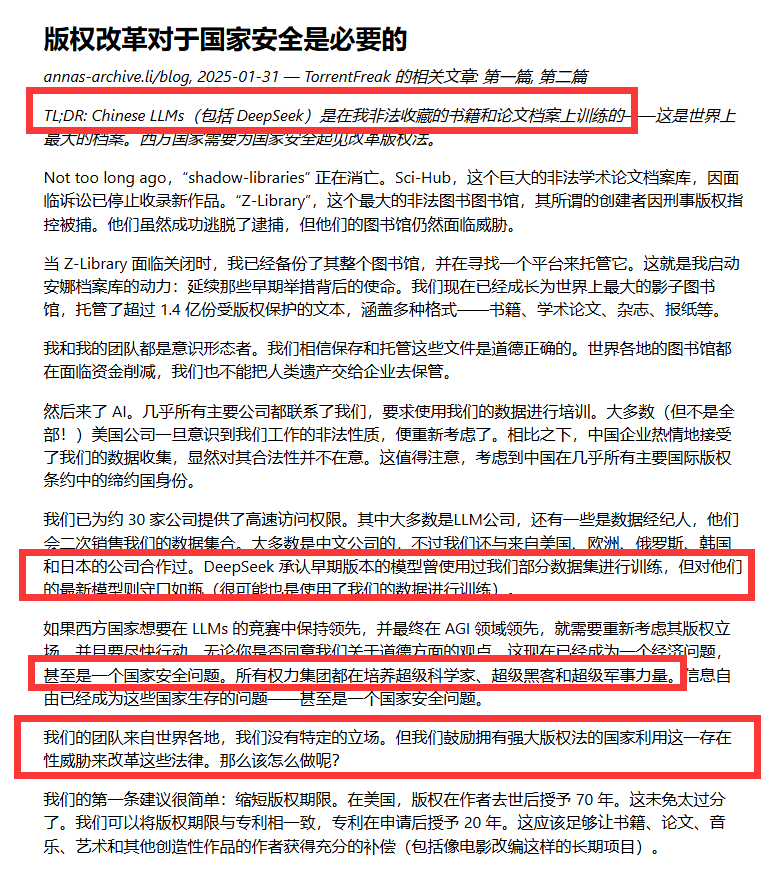 Doiiars 发表于 2025-2-20 10:34 我很讨厌安娜的图书馆透露顾客姓名的事情。出卖了Deepseek,还呼吁如果欧美不放开版权限制,将无法封锁中国 ...